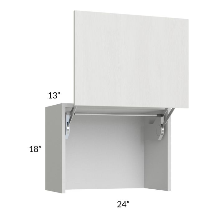 Wall appliance cabinet that is meant to sit on the countertop to hide appliances, it will have an open floor and no bottom rail. It features Blum Lift-Up & Away Hinges to allow the door to lift up and away from the face frame of the cabinet. It will be shipped with a support bracket to be removed before cabinet installation.