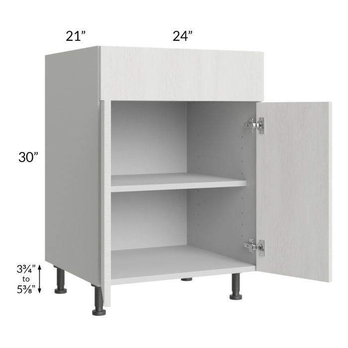 Vanity base cabinet with (2) doors, (1) drawer, and (1) 18" deep shelf. The drawer front is 6-3/4" high. Black, adjustable, plastic furniture feet will also be included which will add 3-3/4" to 5-3/8" to the 30" height.
