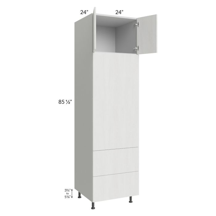 Combo oven cabinet with two 17-7/8" high doors on top and two 11-7/16" high drawers on bottom (height is drawer front height). The oven cabinet has a full panel that will need to be cut on site, the maximum cutout is 22"W x 43-3/4"H. When using two appliances, it is recommended to provide support for the top appliance; PLY-3/4 can be used and would need to be purchased separately, and then installed on site. Black, adjustable, plastic furniture feet will also be included which will add 3-3/4" to 5-3/8" to the 85-1/2" height.