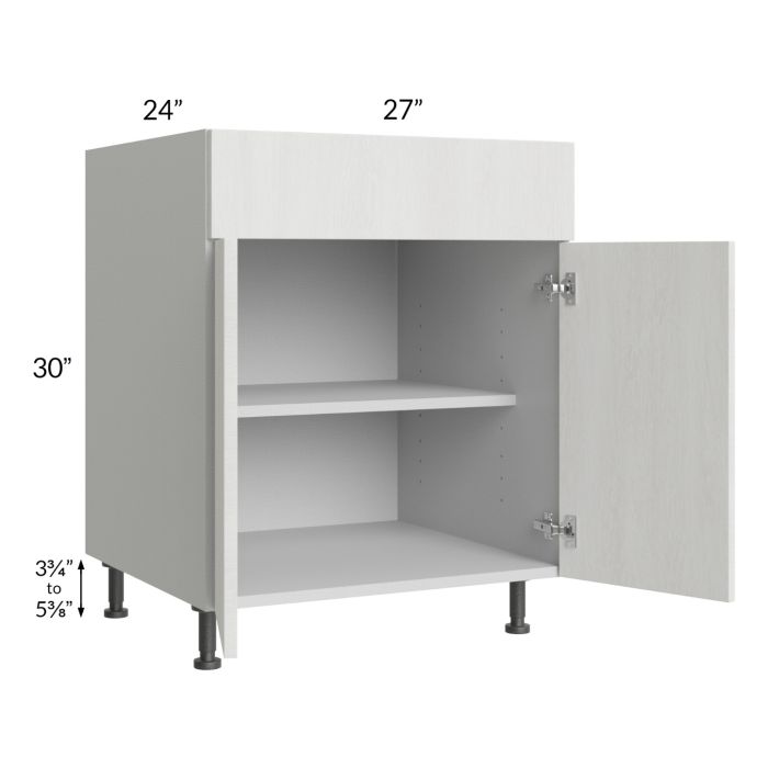 2 door base cabinet with (1) 18" deep adjustable shelves and 1 drawer. Black, adjustable, plastic furniture feet will also be included which will add 3-3/4" to 5-3/8" to the 30" height.
