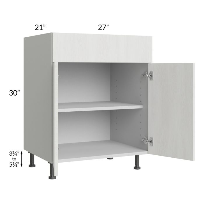 Vanity base cabinet with (2) doors, (1) drawer, and (1) 18" deep shelf. The drawer front is 6-3/4" high. Black, adjustable, plastic furniture feet will also be included which will add 3-3/4" to 5-3/8" to the 30" height.