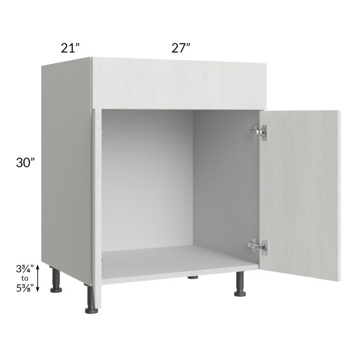 Vanity sink base cabinet with 2 doors and 1 false drawer front. Drawer front is 6-3/4" high. This cabinet will not have any shelves. Black, adjustable, plastic furniture feet will also be included which will add 3-3/4" to 5-3/8" to the 30" height.
