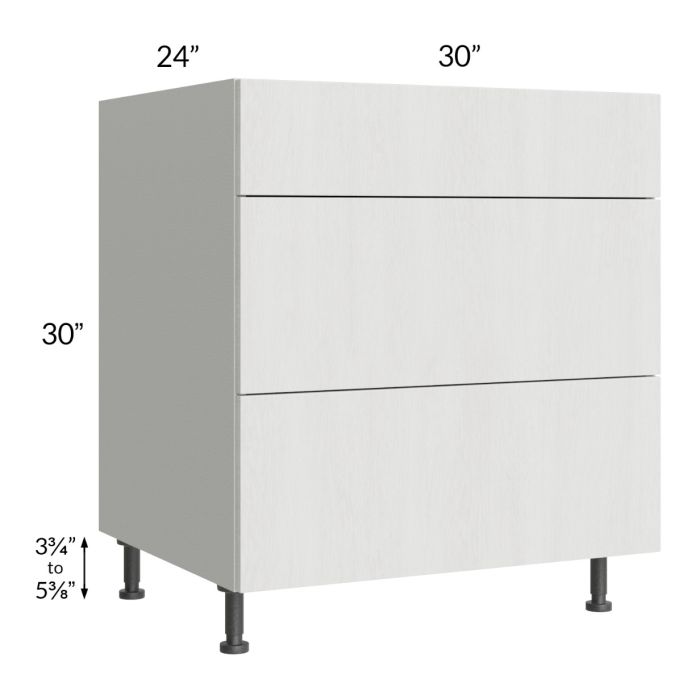 3 drawer base cabinet. Top drawer front is 6-3/4" high, middle and bottom drawer fronts are 11-7/16" separately. Black, adjustable, plastic furniture feet will also be included which will add 3-3/4" to 5-3/8" to the 30" height.