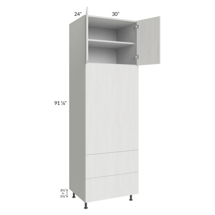 Combo oven cabinet with two 23-7/8" high doors on top with one shelf, and two 11-7/16" high drawers on bottom (height is drawer front height). The oven cabinet has a full panel that will need to be cut on site, the maximum cutout is 28"W x 43-3/4"H. When using two appliances, it is recommended to provide support for the top appliance; PLY-3/4 can be used and would need to be purchased separately, and then installed on site. Black, adjustable, plastic furniture feet will also be included which will add 3-3/4" to 5-3/8" to the 91-1/2" height.