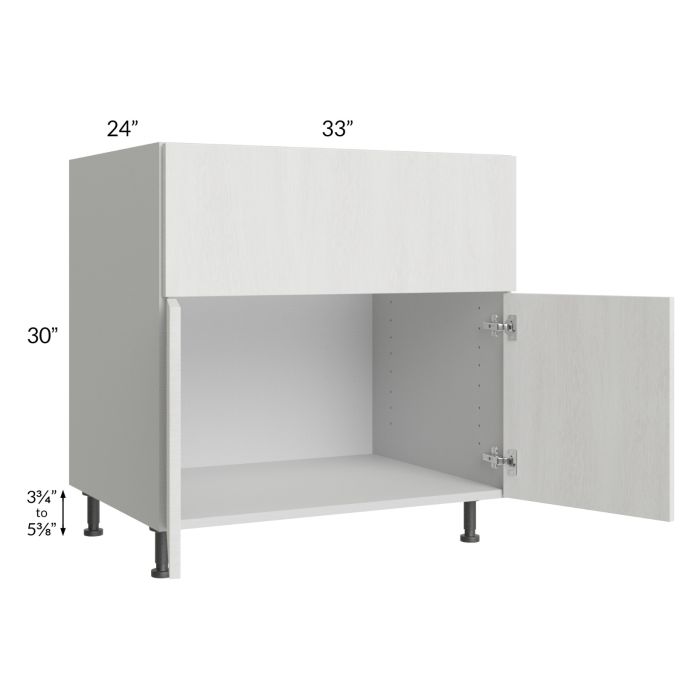 Farm sink base cabinet. Door heights are 17-7/8" and the height above the doors to the top of the cabinet is 11-7/8". Typically, the farm sink base should be a minimum of 3" wider than the farm sink (for example, a 30" farm sink would need a 33" farm sink base). The front panel is attached with clips for easy removal and install. Once removed, the opening will need to be cut, the maximumum it can be cut is 31-1/2"W x 11-5/8"H, then the panel will be reattached back onto the cabinet. To avoid damage to the frame and side panels, please apply extra care when cutting the front panel, blue masking tape is the most commonly used to avoid splintering (strong adhesives must be avoided to avoid pulling the finish off). Black, adjustable, plastic furniture feet will also be included which will add 3-3/4" to 5-3/8" to the 30" height.