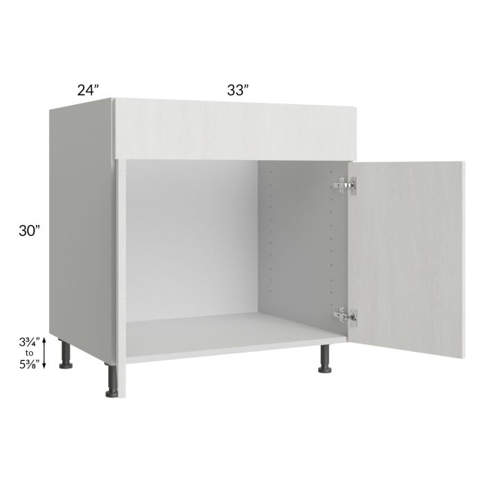 Sink base cabinet with 2 doors and (1) 6-3/4" false drawer front. This cabinet will have no shelves (the sides will come pre-drilled with shelf clip holes if loose shelves are needed - which need to be purchased separately). Black, adjustable, plastic furniture feet will also be included which will add 3-3/4" to 5-3/8" to the 30" height.