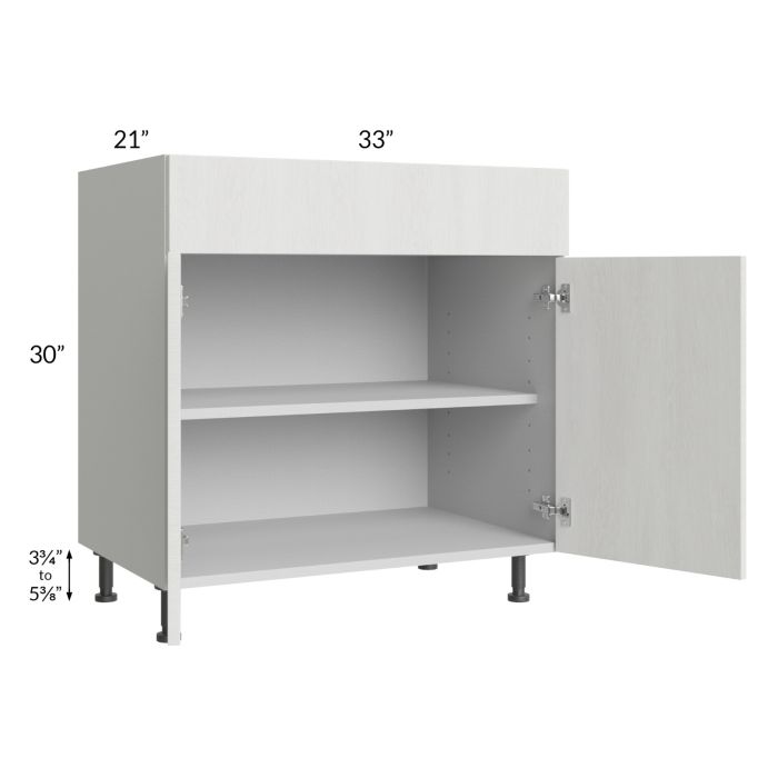 Vanity base cabinet with (2) doors, (1) drawer, and (1) 18" deep shelf. The drawer front is 6-3/4" high. Black, adjustable, plastic furniture feet will also be included which will add 3-3/4" to 5-3/8" to the 30" height.
