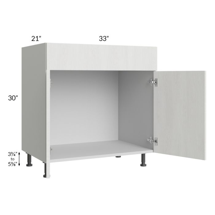 Vanity sink base cabinet with 2 doors and 1 false drawer front. Drawer front is 6-3/4" high. This cabinet will not have any shelves. Black, adjustable, plastic furniture feet will also be included which will add 3-3/4" to 5-3/8" to the 30" height.