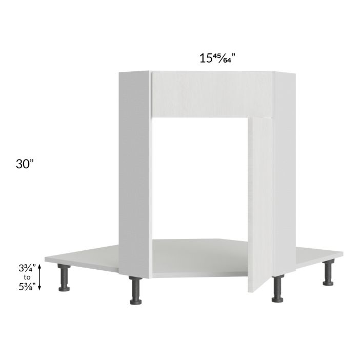 Diagonal corner sink front that will take up 36" of wall space from the corner out, on each wall, once installed. The door width is 15-45/64" and it uses 45-degree hinges with Blumotion soft close. The false drawer front is 6-3/4" high. It will include the sink front floor as well as four black, adjustable, plastic furniture feet will also be included which will add 3-3/4" to 5-3/8" to the 30" height. No shelves will be included.