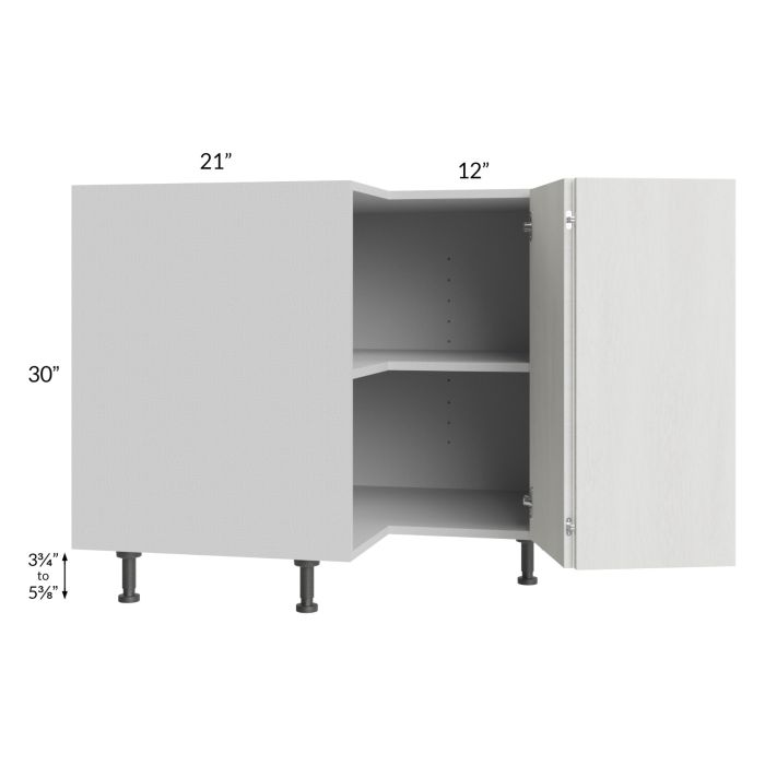 Easy reach corner cabinet that will take up 33" from the corner out, on each wall. It comes with one adjustable shelf and will not have soft close hinges. The cabinet will have a 21" depth for an easier installation, however due to the smaller depth, it must be pulled out 3" off both walls (thus, taking up 24" of wall space on each wall). This gap will not be visible once countertops are installed. Once assembled, the door cannot be reversed, so be sure to specify left or right hinging (as if facing the cabinet). Black, adjustable, plastic furniture feet will also be included which will add 3-3/4" to 5-3/8" to the 30" height.