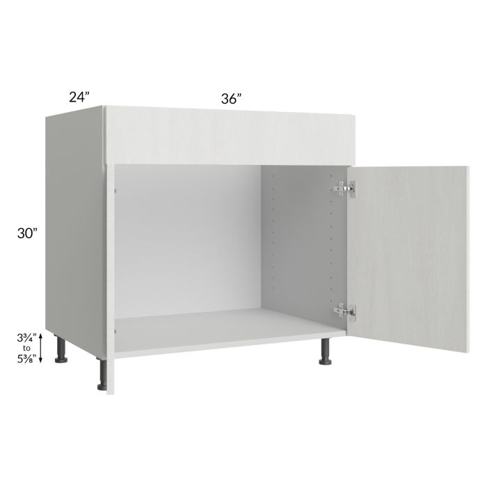 Sink base cabinet with 2 doors and (1) 6-3/4" false drawer front. This cabinet will have no shelves (the sides will come pre-drilled with shelf clip holes if loose shelves are needed - which need to be purchased separately). Black, adjustable, plastic furniture feet will also be included which will add 3-3/4" to 5-3/8" to the 30" height.