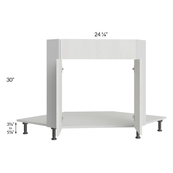 Diagonal corner sink front that will take up 42" of wall space from the corner out, on each wall, once installed. There will be 2 doors, each measuring 12-1/16" wide, which use 45-degree hinges with Blumotion soft close. The false drawer front is 6-3/4" high. It will include the sink front floor as well as four black, adjustable, plastic furniture feet will also be included which will add 3-3/4" to 5-3/8" to the 30" height. No shelves will be included.