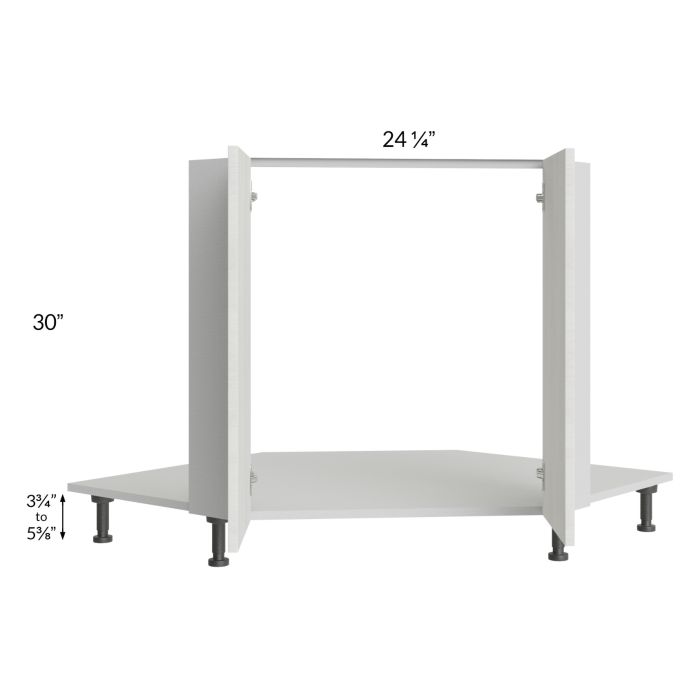 Full height door diagonal corner sink front that will take up 42" of wall space from the corner out, on each wall, once installed. There will be 2 doors, each measuring 12-1/16" wide, which use 45-degree hinges with Blumotion soft close. It will include the sink front floor as well as four black, adjustable, plastic furniture feet will also be included which will add 3-3/4" to 5-3/8" to the 30" height. No shelves will be included.
