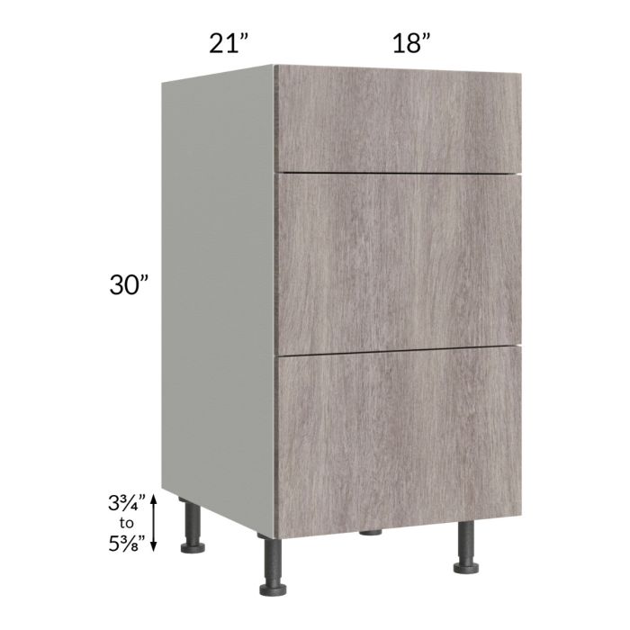 3-drawer vanity base cabinet. Top drawer front is 6-3/4", middle and bottom drawer fronts are 11-7/16" high. Black, adjustable, plastic furniture feet will also be included which will add 3-3/4" to 5-3/8" to the 30" height.