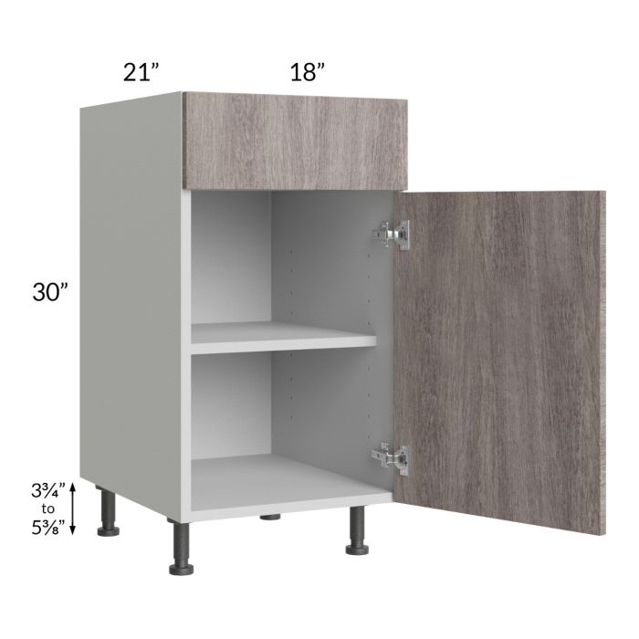 Vanity base cabinet with (1) door, (1) drawer, and (1) 18" deep shelf. The drawer front is 6-3/4" high. Black, adjustable, plastic furniture feet will also be included which will add 3-3/4" to 5-3/8" to the 30" height.