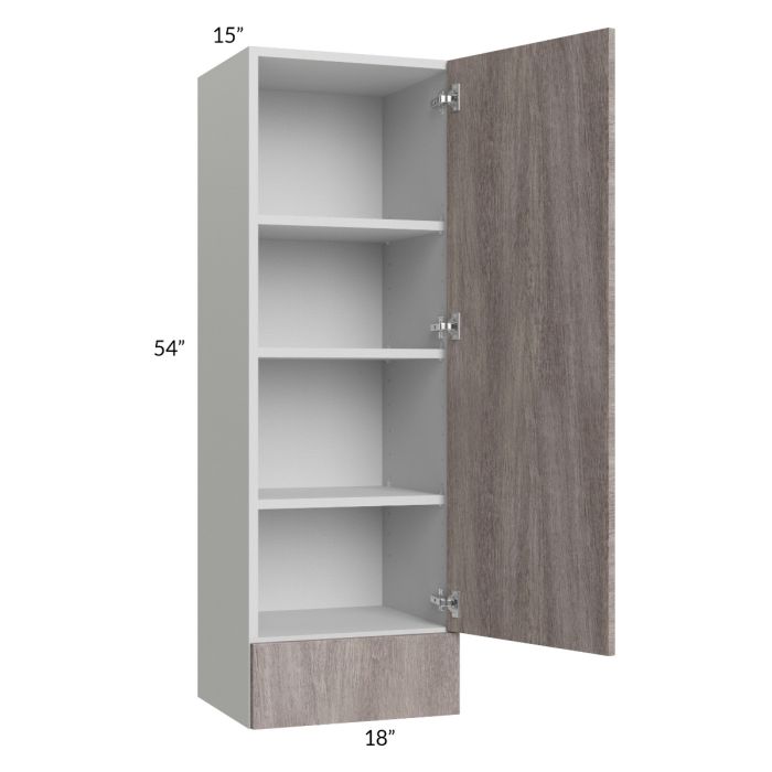 Wall cabinet with (1) 6-3/4" drawer on bottom (drawer front height) and (1) 47" high door on top. There will be 3 adjustable shelves on the top of the cabinet. The exposed sides have near-flush ends and are unfinished, wainscot panels can be ordered to finish exposed sides. **Note this cabinet has a 15" depth**