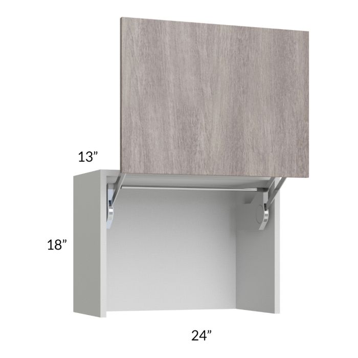 Wall appliance cabinet that is meant to sit on the countertop to hide appliances, it will have an open floor and no bottom rail. It features Blum Lift-Up & Away Hinges to allow the door to lift up and away from the face frame of the cabinet. It will be shipped with a support bracket to be removed before cabinet installation.