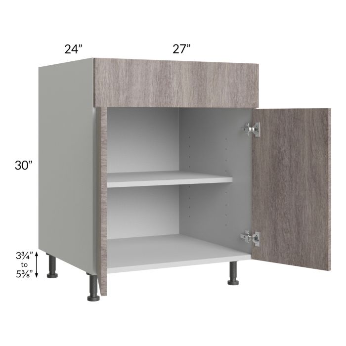 2 door base cabinet with (1) 18" deep adjustable shelves and 1 drawer. Black, adjustable, plastic furniture feet will also be included which will add 3-3/4" to 5-3/8" to the 30" height.