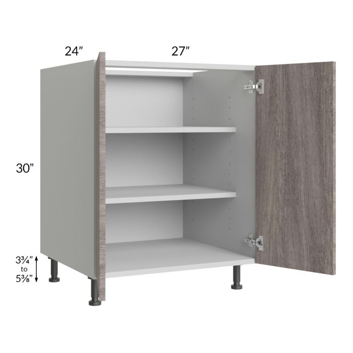 2 full height door base cabinet with (2) 18" deep adjustable shelves. Black, adjustable, plastic furniture feet will also be included which will add 3-3/4" to 5-3/8" to the 30" height. Please note that the shelves will not be included if roll outs are added to the cabinet.