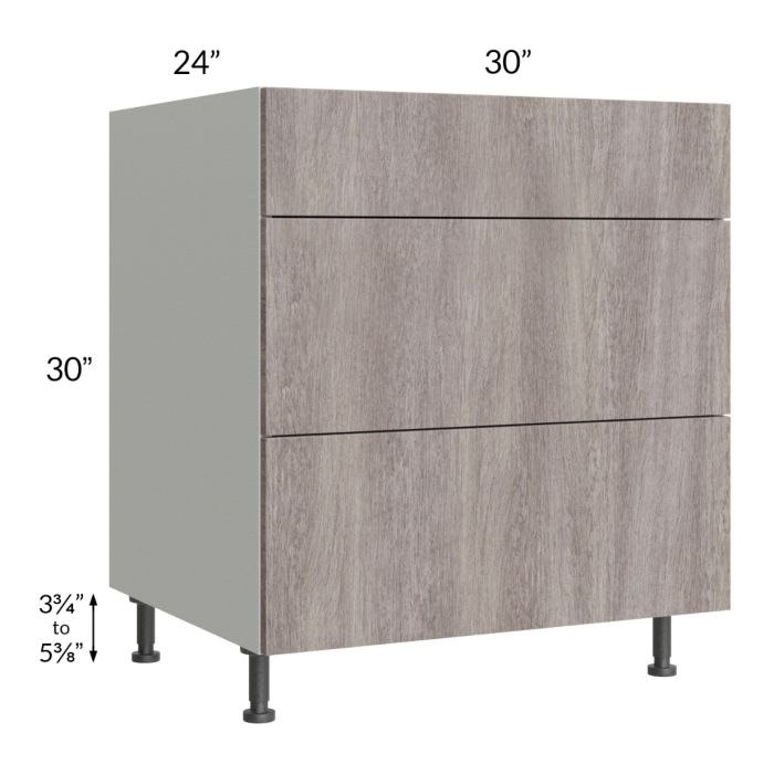 3 drawer base cabinet. Top drawer front is 6-3/4" high, middle and bottom drawer fronts are 11-7/16" separately. Black, adjustable, plastic furniture feet will also be included which will add 3-3/4" to 5-3/8" to the 30" height.