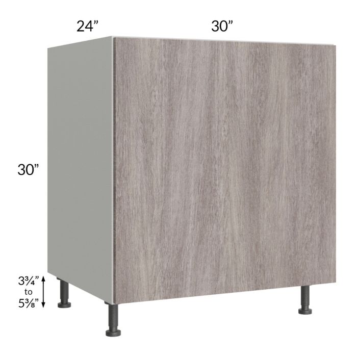 Base oven cabinet. The front panel is attached with clips for easy removal and install. Once removed, the opening will need to be cut, the maximum it can be cut is 28-1/2"W x 28-1/2"H, then the panel will be reattached back onto the cabinet. To avoid damage to the frame and side panels, please apply extra care when cutting the front panel, blue masking tape is the most commonly used to avoid splintering (strong adhesives must be avoided to avoid pulling the finish off). Black, adjustable, plastic furniture feet will also be included which will add 3-3/4" to 5-3/8" to the 30" height. *A heat shield will need to be used on both sides of an oven base cabinet or range-top base cabinet to shield the adjacent cabinet boxes from the oven heat. This can be added from the 'View Options' area for this cabinet. Each heat shield will be 30" high and can be cut to size, as needed (sold in quantities of 1, a quantity of 2 must be ordered to receive 2 heat shields).*