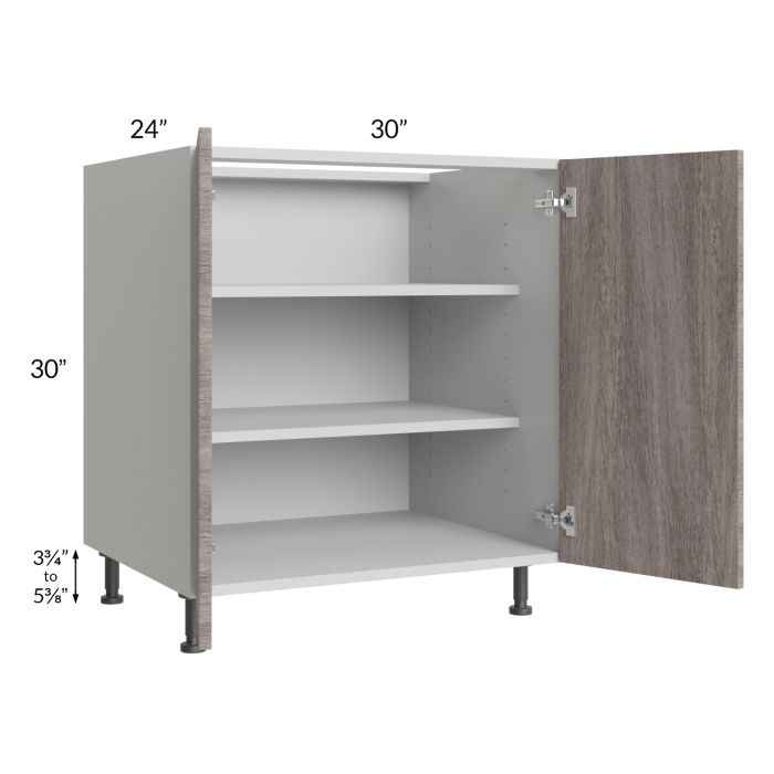 2 full height door base cabinet with (2) 18" deep adjustable shelves. Black, adjustable, plastic furniture feet will also be included which will add 3-3/4" to 5-3/8" to the 30" height. Please note that the shelves will not be included if roll outs are added to the cabinet.