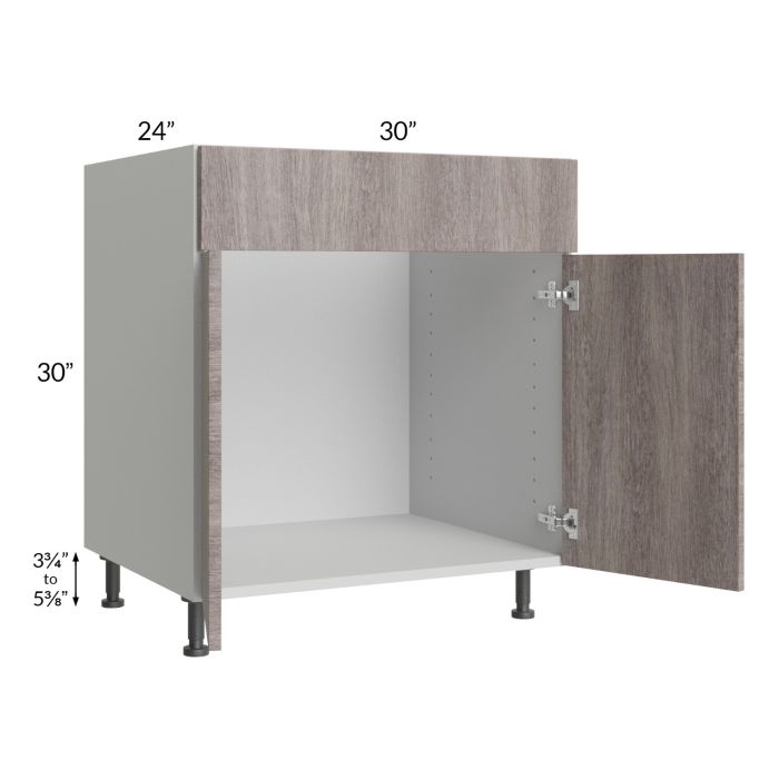 Sink base cabinet with 2 doors and (1) 6-3/4" false drawer front. This cabinet will have no shelves (the sides will come pre-drilled with shelf clip holes if loose shelves are needed - which need to be purchased separately). Black, adjustable, plastic furniture feet will also be included which will add 3-3/4" to 5-3/8" to the 30" height.
