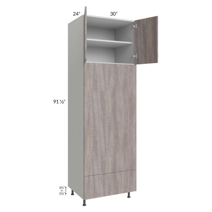 Double oven cabinet with two 23-7/8" high doors on top with one shelf, and one 11-7/16" high drawer on bottom (height is drawer front height). The oven cabinet has a full panel that will need to be cut on site, the maximum cutout is 28"W x 55"H. When using two appliances, it is recommended to provide support for the top appliance; PLY-3/4 can be used and would need to be purchased separately, and then installed on site. Black, adjustable, plastic furniture feet will also be included which will add 3-3/4" to 5-3/8" to the 91-1/2" height.