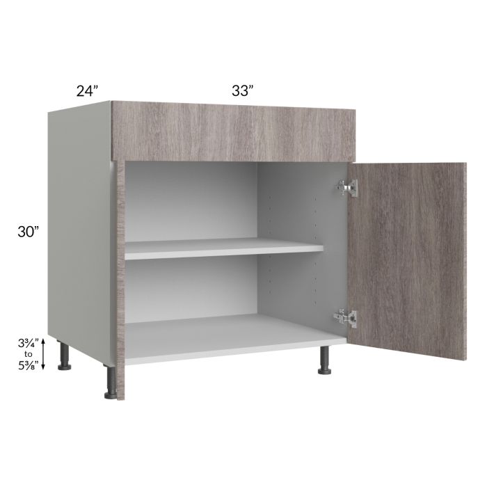 2 door base cabinet with (1) 18" deep adjustable shelves and 1 drawer. Black, adjustable, plastic furniture feet will also be included which will add 3-3/4" to 5-3/8" to the 30" height.