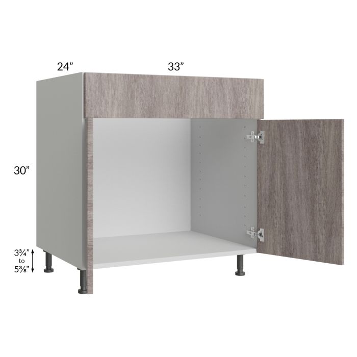 Sink base cabinet with 2 doors and (1) 6-3/4" false drawer front. This cabinet will have no shelves (the sides will come pre-drilled with shelf clip holes if loose shelves are needed - which need to be purchased separately). Black, adjustable, plastic furniture feet will also be included which will add 3-3/4" to 5-3/8" to the 30" height.