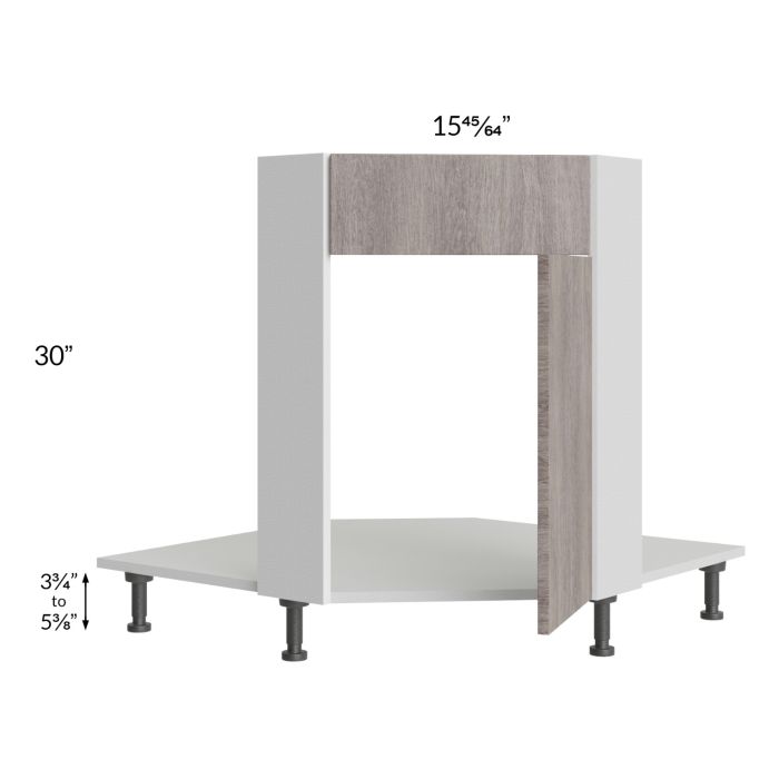 Diagonal corner sink front that will take up 36" of wall space from the corner out, on each wall, once installed. The door width is 15-45/64" and it uses 45-degree hinges with Blumotion soft close. The false drawer front is 6-3/4" high. It will include the sink front floor as well as four black, adjustable, plastic furniture feet will also be included which will add 3-3/4" to 5-3/8" to the 30" height. No shelves will be included.