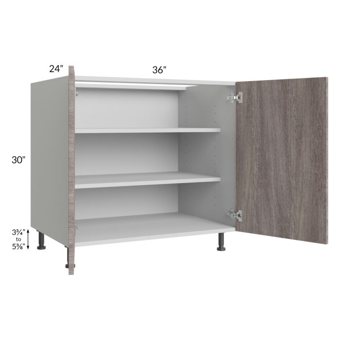 2 full height door base cabinet with (2) 18" deep adjustable shelves. Black, adjustable, plastic furniture feet will also be included which will add 3-3/4" to 5-3/8" to the 30" height. Please note that the shelves will not be included if roll outs are added to the cabinet.