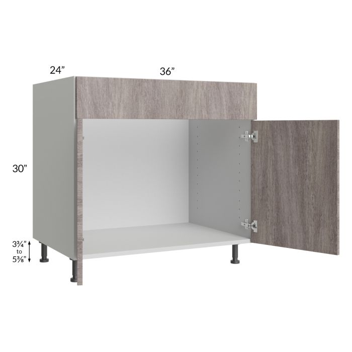 Sink base cabinet with 2 doors and (1) 6-3/4" false drawer front. This cabinet will have no shelves (the sides will come pre-drilled with shelf clip holes if loose shelves are needed - which need to be purchased separately). Black, adjustable, plastic furniture feet will also be included which will add 3-3/4" to 5-3/8" to the 30" height.