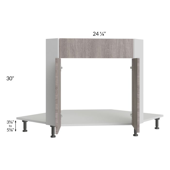 Diagonal corner sink front that will take up 42" of wall space from the corner out, on each wall, once installed. There will be 2 doors, each measuring 12-1/16" wide, which use 45-degree hinges with Blumotion soft close. The false drawer front is 6-3/4" high. It will include the sink front floor as well as four black, adjustable, plastic furniture feet will also be included which will add 3-3/4" to 5-3/8" to the 30" height. No shelves will be included.