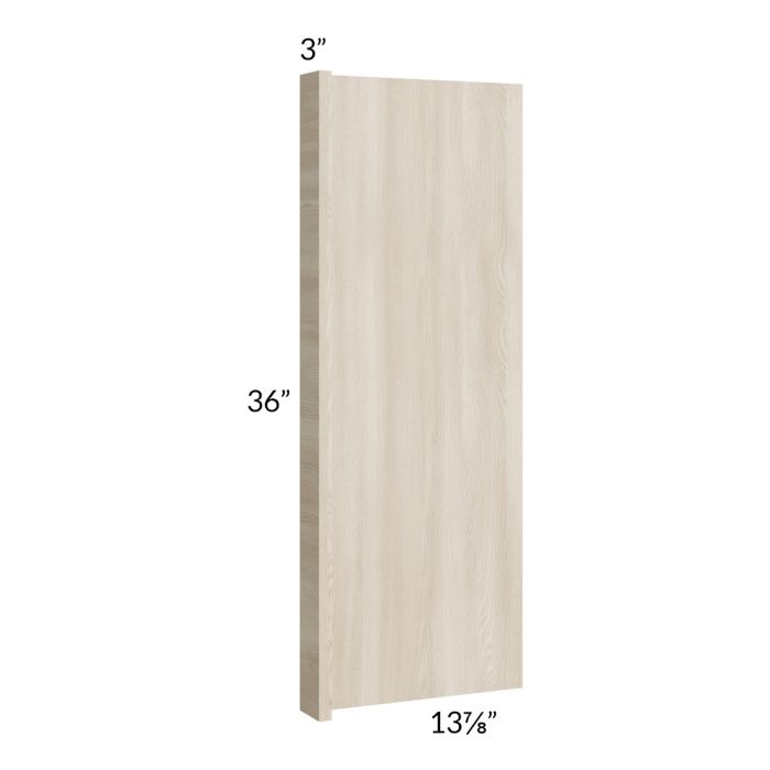Wall end panel with a filler attached to the front that will be finished on two sides and edge-banded on all four edges. The filler on the front will be flush with the side and can be cut down if needed. If it is cut, to avoid damage to the frame and side panels, please apply extra care when cutting the front panel, blue masking tape is the most commonly used to avoid splintering (strong adhesives must be avoided to avoid pulling the finish off).