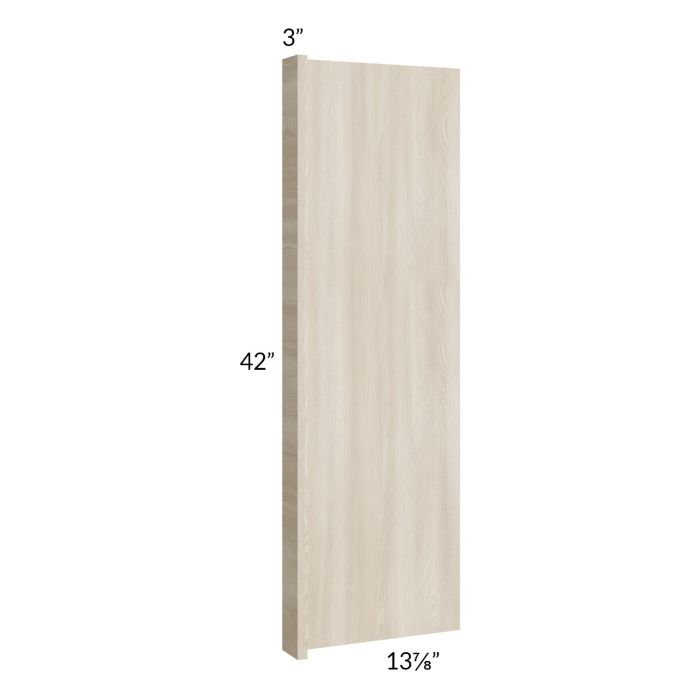 Wall end panel with a filler attached to the front that will be finished on two sides and edge-banded on all four edges. The filler on the front will be flush with the side and can be cut down if needed. If it is cut, to avoid damage to the frame and side panels, please apply extra care when cutting the front panel, blue masking tape is the most commonly used to avoid splintering (strong adhesives must be avoided to avoid pulling the finish off).