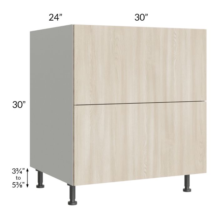 2 drawer base cabinet. Each drawer front measures 14-7/8" high. Black, adjustable, plastic furniture feet will also be included which will add 3-3/4" to 5-3/8" to the 30" height.