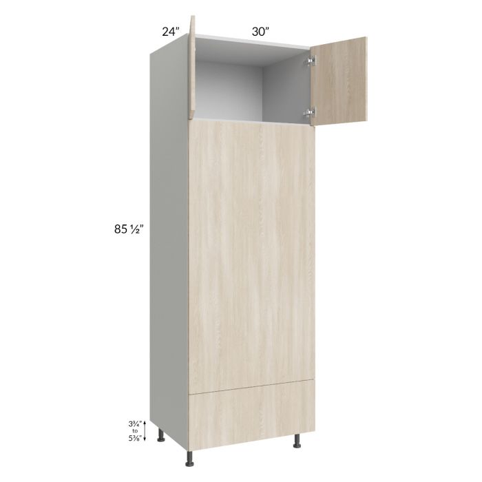 Double oven cabinet with two 17-7/8" high doors on top and one 11-7/16" high drawer on bottom (height is drawer front height). The oven cabinet has a full panel that will need to be cut on site, the maximum cutout is 28"W x 55"H. When using two appliances, it is recommended to provide support for the top appliance; PLY-3/4 can be used and would need to be purchased separately, and then installed on site. Black, adjustable, plastic furniture feet will also be included which will add 3-3/4" to 5-3/8" to the 85-1/2" height.
