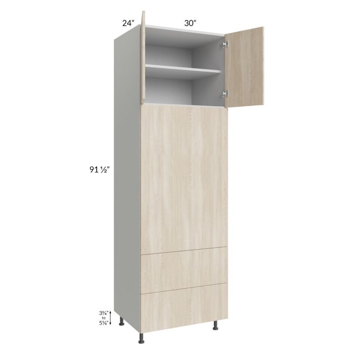 Combo oven cabinet with two 23-7/8" high doors on top with one shelf, and two 11-7/16" high drawers on bottom (height is drawer front height). The oven cabinet has a full panel that will need to be cut on site, the maximum cutout is 28"W x 43-3/4"H. When using two appliances, it is recommended to provide support for the top appliance; PLY-3/4 can be used and would need to be purchased separately, and then installed on site. Black, adjustable, plastic furniture feet will also be included which will add 3-3/4" to 5-3/8" to the 91-1/2" height.