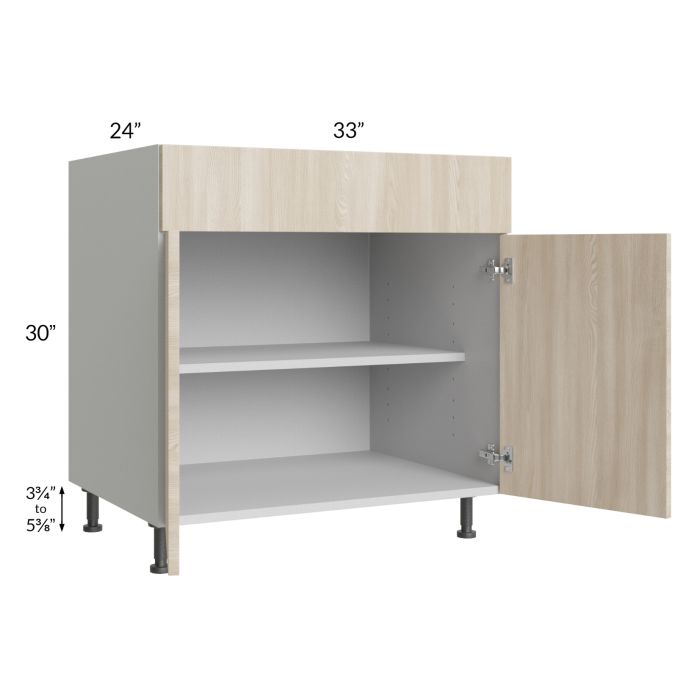 2 door base cabinet with (1) 18" deep adjustable shelves and 1 drawer. Black, adjustable, plastic furniture feet will also be included which will add 3-3/4" to 5-3/8" to the 30" height.