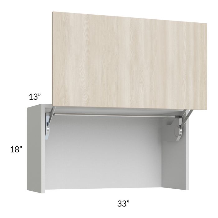 Wall appliance cabinet that is meant to sit on the countertop to hide appliances, it will have an open floor and no bottom rail. It features Blum Lift-Up & Away Hinges to allow the door to lift up and away from the face frame of the cabinet. It will be shipped with a support bracket to be removed before cabinet installation.