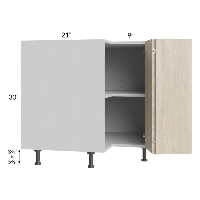 Easy reach corner cabinet that will take up 33" from the corner out, on each wall. It comes with one adjustable shelf and will not have soft close hinges. The cabinet will have a 21" depth for an easier installation, however due to the smaller depth, it must be pulled out 3" off both walls (thus, taking up 24" of wall space on each wall). This gap will not be visible once countertops are installed. Once assembled, the door cannot be reversed, so be sure to specify left or right hinging (as if facing the cabinet). Black, adjustable, plastic furniture feet will also be included which will add 3-3/4" to 5-3/8" to the 30" height.