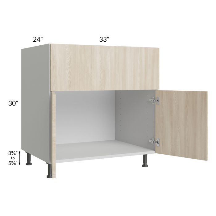 Farm sink base cabinet. Door heights are 17-7/8" and the height above the doors to the top of the cabinet is 11-7/8". Typically, the farm sink base should be a minimum of 3" wider than the farm sink (for example, a 30" farm sink would need a 33" farm sink base). The front panel is attached with clips for easy removal and install. Once removed, the opening will need to be cut, the maximumum it can be cut is 31-1/2"W x 11-5/8"H, then the panel will be reattached back onto the cabinet. To avoid damage to the frame and side panels, please apply extra care when cutting the front panel, blue masking tape is the most commonly used to avoid splintering (strong adhesives must be avoided to avoid pulling the finish off). Black, adjustable, plastic furniture feet will also be included which will add 3-3/4" to 5-3/8" to the 30" height.