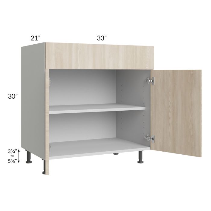 Vanity base cabinet with (2) doors, (1) drawer, and (1) 18" deep shelf. The drawer front is 6-3/4" high. Black, adjustable, plastic furniture feet will also be included which will add 3-3/4" to 5-3/8" to the 30" height.