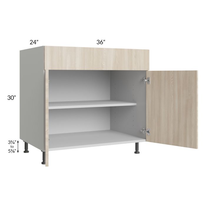 2 door base cabinet with (1) 18" deep adjustable shelves and 1 drawer. Black, adjustable, plastic furniture feet will also be included which will add 3-3/4" to 5-3/8" to the 30" height.