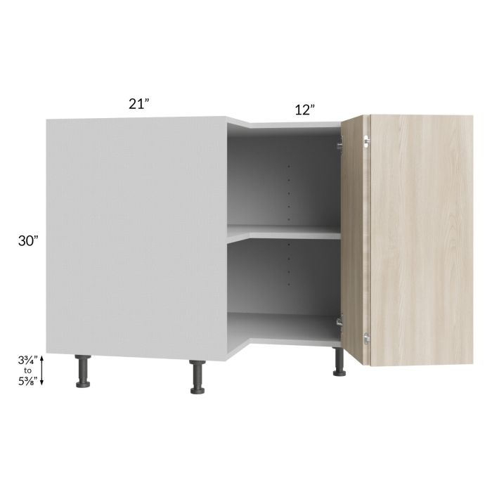 Easy reach corner cabinet that will take up 33" from the corner out, on each wall. It comes with one adjustable shelf and will not have soft close hinges. The cabinet will have a 21" depth for an easier installation, however due to the smaller depth, it must be pulled out 3" off both walls (thus, taking up 24" of wall space on each wall). This gap will not be visible once countertops are installed. Once assembled, the door cannot be reversed, so be sure to specify left or right hinging (as if facing the cabinet). Black, adjustable, plastic furniture feet will also be included which will add 3-3/4" to 5-3/8" to the 30" height.