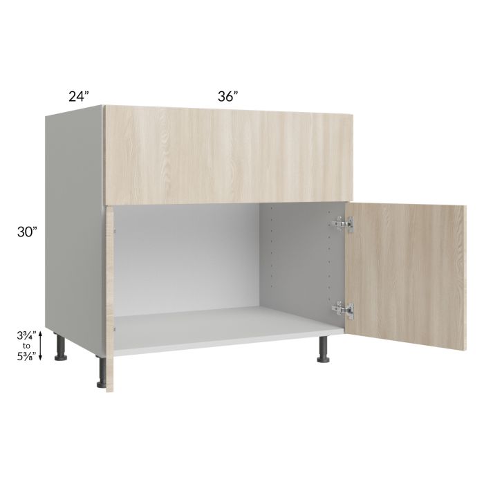 Farm sink base cabinet. Door heights are 17-7/8" and the height above the doors to the top of the cabinet is 11-7/8". Typically, the farm sink base should be a minimum of 3" wider than the farm sink (for example, a 30" farm sink would need a 33" farm sink base).The front panel is attached with clips for easy removal and install. Once removed, the opening will need to be cut, the maximumum it can be cut is 34-1/2"W x 11-5/8"H, then the panel will be reattached back onto the cabinet. To avoid damage to the frame and side panels, please apply extra care when cutting the front panel, blue masking tape is the most commonly used to avoid splintering (strong adhesives must be avoided to avoid pulling the finish off). Black, adjustable, plastic furniture feet will also be included which will add 3-3/4" to 5-3/8" to the 30" height.