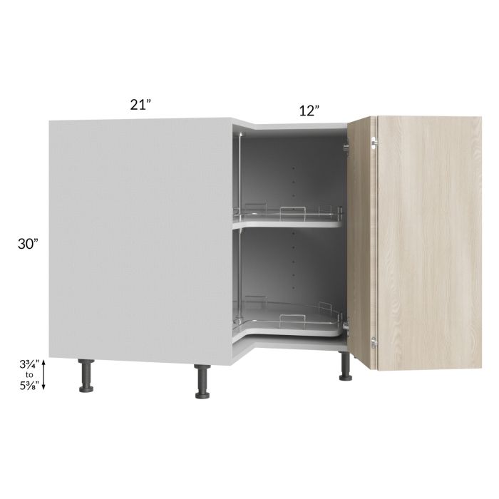Lazy susan base cabinet that will take up 36" from the corner out, on each wall. Both wooden Lazy Susan trays rotate independently and the center tray is mounted on a 3/4" adjustable shelf. This cabinet cannot use a soft close hinge. Each bi-fold door is 12" wide. It is designed to have a smaller footprint for ease of installation (which is why the depth is 21"). Black, adjustable, plastic furniture feet will also be included which will add 3-3/4" to 5-3/8" to the 30" height.
