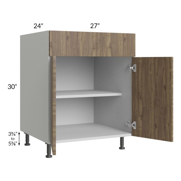 2 door base cabinet with (1) 18" deep adjustable shelves and 1 drawer. Black, adjustable, plastic furniture feet will also be included which will add 3-3/4" to 5-3/8" to the 30" height.