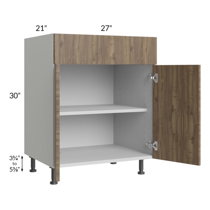 Vanity base cabinet with (2) doors, (1) drawer, and (1) 18" deep shelf. The drawer front is 6-3/4" high. Black, adjustable, plastic furniture feet will also be included which will add 3-3/4" to 5-3/8" to the 30" height.